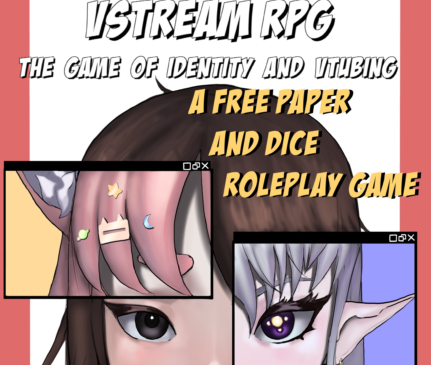 VStream RPG brings the love of vtubers and roleplaying together. With a universal character creation system and simple original rules, gameplay focuses on the stories that these vtuber characters want to tell through their lore and personalities. A single ten-sided die along with a pencil and scrap paper are all that you and gaming friends need for unique vtubing experiences. Two distinct game modes allow for either squeaky-clean or edgy naughty storytelling with guidelines which everyone at the table can understand. A Creative Commons license covers the entire game and all related assets, so you may feel free to change and redistribute the game however you like.